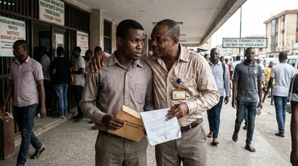 Nigerian scammers love the “Man Know Man” card. They’ll tell you they have a cousin working at the VFS Global office or a friend in the US Embassy who can “pull files” to the top.