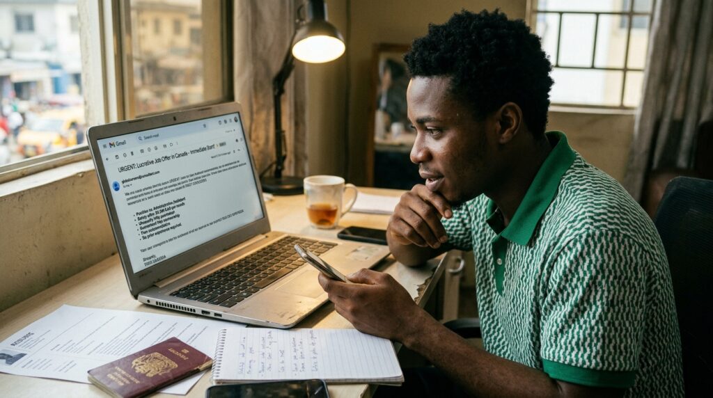 Real-Life Situation: Take the story of “Chidi” (name changed). He paid an agent ₦3.5 million for a “guaranteed” construction job in Canada. The agent gave him a beautiful, stamped offer letter. When Chidi arrived at Pearson Airport in Toronto, the border officer looked at the letter and laughed—the company on the letterhead didn’t even exist. Chidi was deported on the next flight.